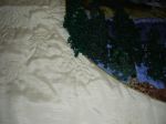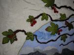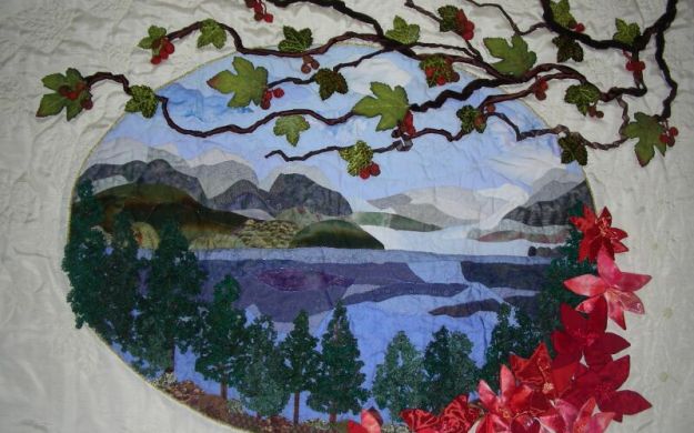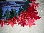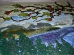 | Sanatçının yorumu | Deniz ve ormanın içkarartan havası, kenardaki kırmızı çiçeklerle dengelenince sakin ve hüzünlü bir atmosfer oluşturmayı başardığımı düşünüyorum. Çınar yaprakları ve tomurcukları da hoş bir hava kattı. Kırmızı çiçekleri ve çınar yapraklarını taklit eden, adeta gölgeleri olan yorganlama da bu tabloyu zenginleştiren bir başka detay. |